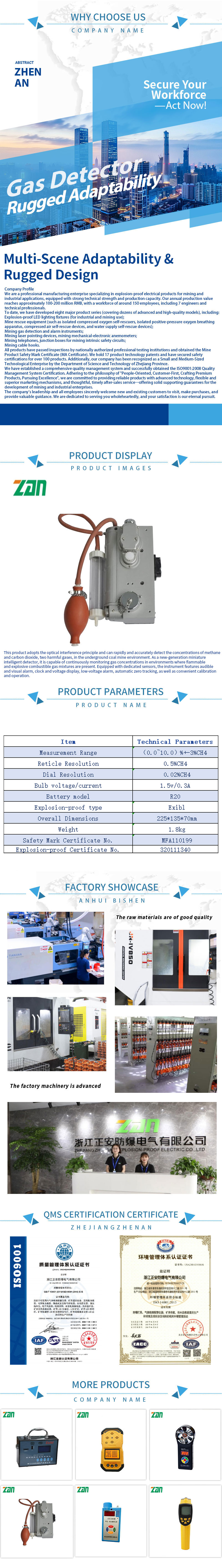 Le produit est conforme aux normes de sécurité nationales et industrielles en vigueur, avec un contrôle qualité strict tout au long du processus de production. Il est largement applicable à la détection de gaz nocifs courants dans les scénarios miniers et peut être adapté de manière flexible aux différentes opérations minières et exigences de gestion de la sécurité. Qu'il s'agisse de détection de patrouille quotidienne ou de surveillance de point fixe, ce détecteur de gaz peut exercer d'excellentes performances, offrant ainsi une solide barrière de sécurité pour la production minière.